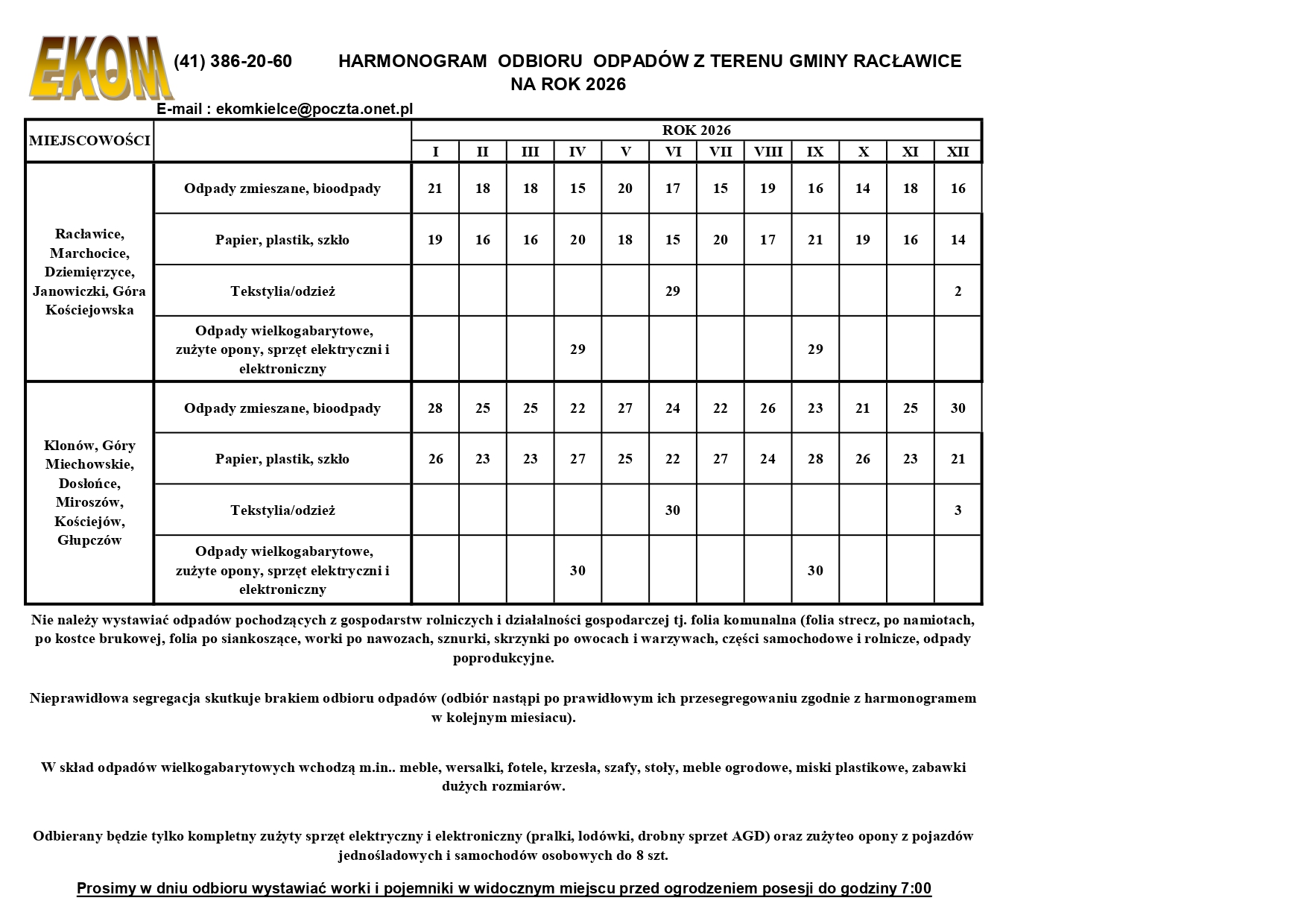 Harmonogram odbioru odpadów komunalnych 2026 r.