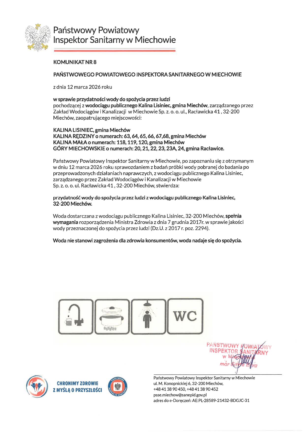 Komunikat w sprawie przydatności wody do spożycia przez ludzi pochodzącej z wodociągu publicznego Kalina Lisiniec dla mieszkańców wsi: Góry Miechowskie nr 20,21,22,23,23A,24