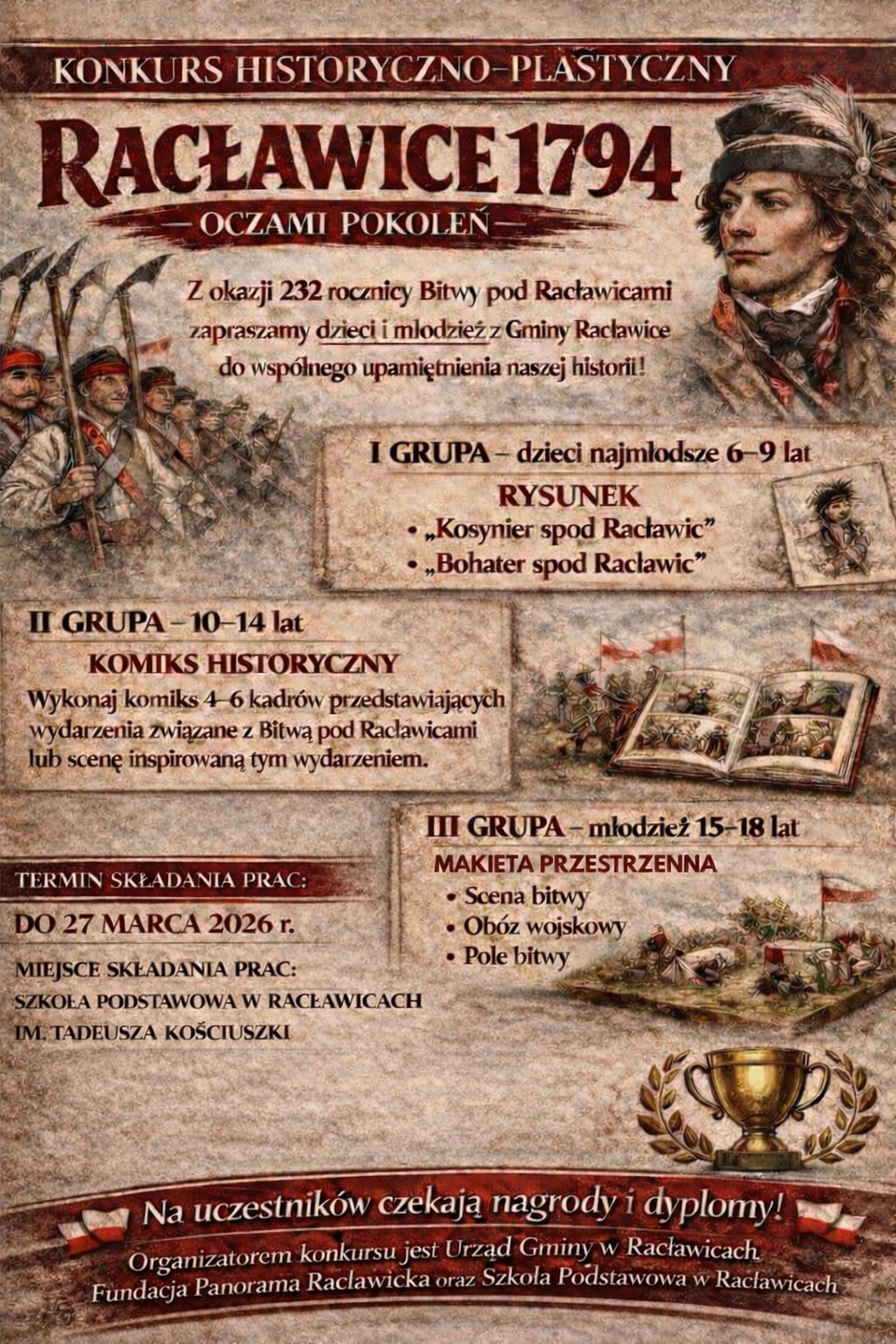 Z okazji 232. rocznicy Bitwa pod Racławicami zapraszamy dzieci i młodzież z Gminy Racławice do udziału w wyjątkowym konkursie historyczno-plastycznym. To doskonała okazja, aby poprzez sztukę i kreatywność upamiętnić wydarzenia związane z naszą lokalną historią.